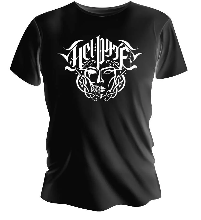 My brand new official t-shirt, featuring my newest wicked cool logo with the two faces of Hel in a powerful design with nordic styling.