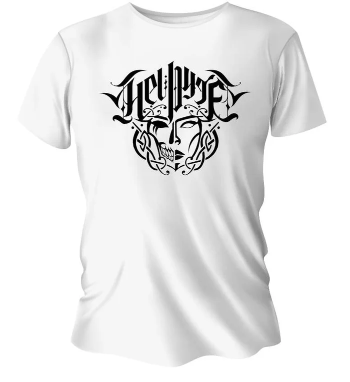 My brand new official t-shirt, featuring my newest wicked cool logo with the two faces of Hel in a powerful design with nordic styling.